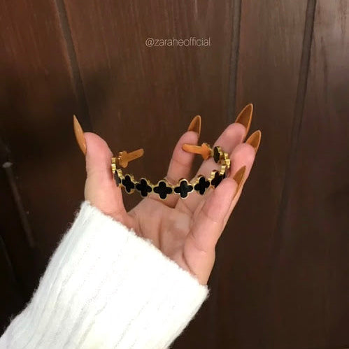 Where timeless beauty meets modern luxury — the ZARAHÉ Elegance Clover Bangle features a sleek row of glossy black clovers framed in radiant gold, symbolising luck, grace, and refined charm. Designed to elevate any outfit, it’s the perfect blend of sophistication and style.