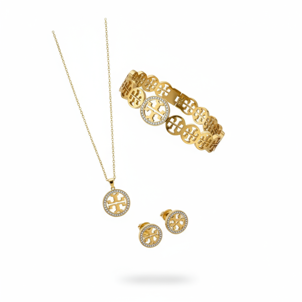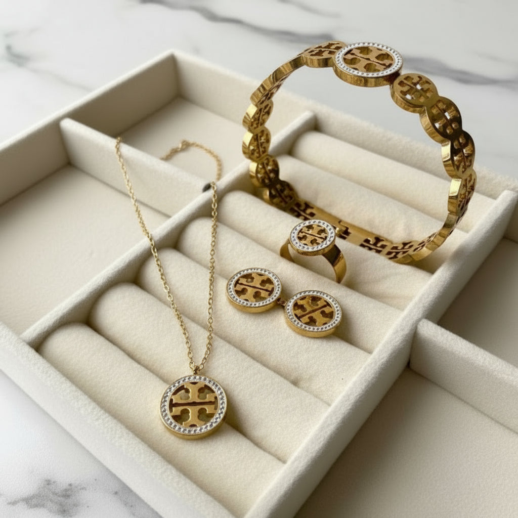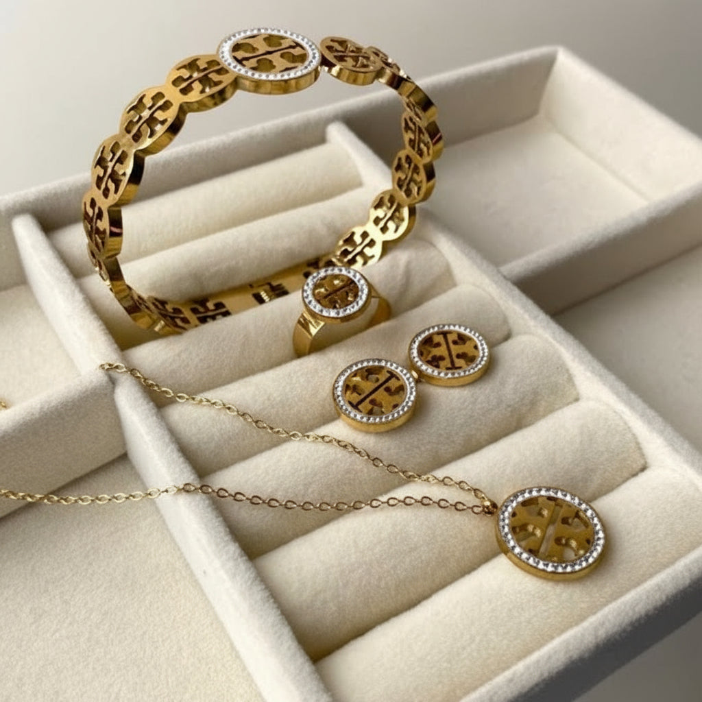 The ZARAHÉ Golden Desire Set is the ultimate expression of luxury and elegance. This exquisite 4-piece collection — featuring a radiant necklace, elegant earrings, a sleek cuff, and a matching ring — is crafted to make every moment unforgettable. Its gleaming 18K gold-plated finish and refined detailing create a look that’s effortlessly chic, whether for a glamorous occasion or everyday sophistication.
