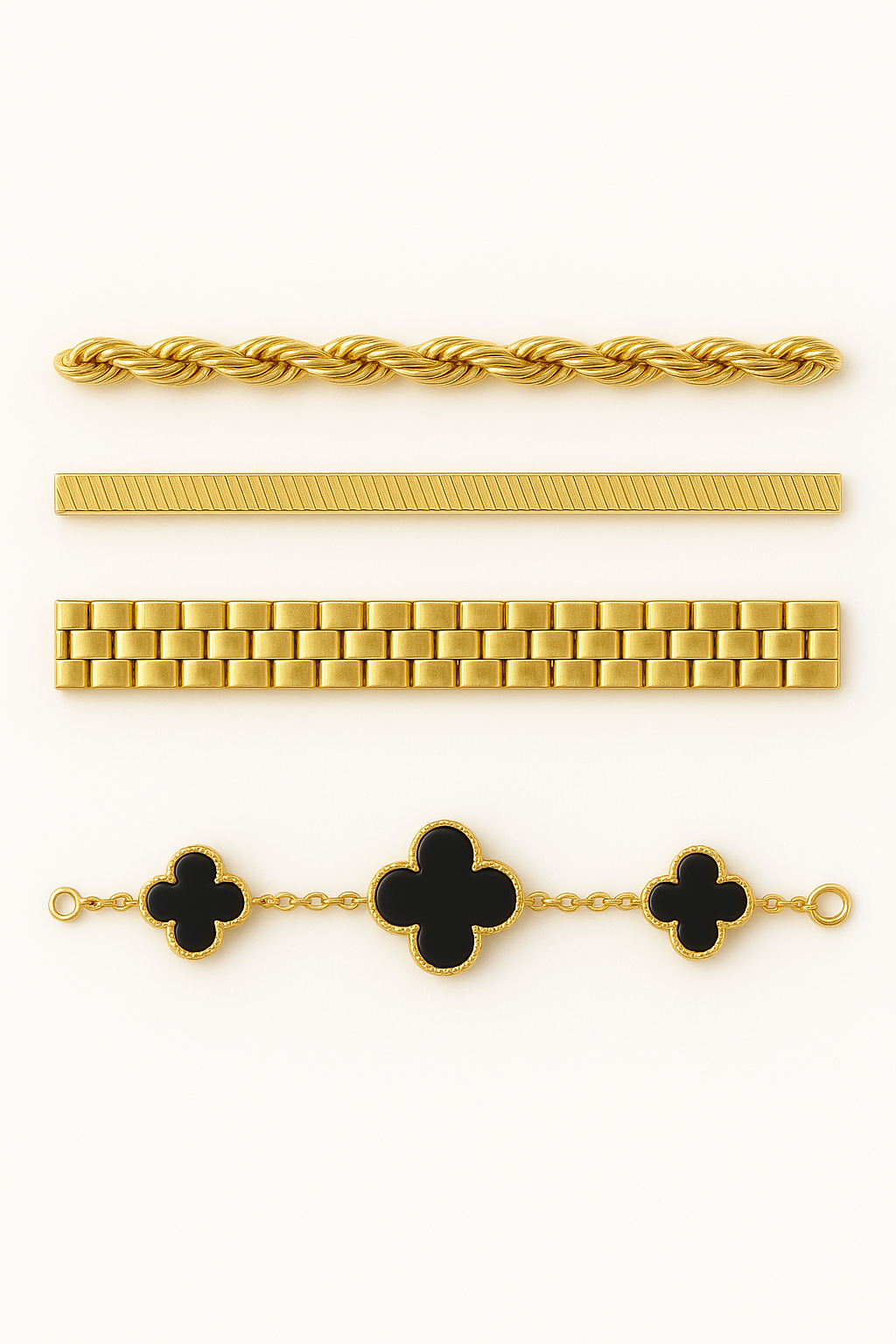 Each bracelet tells a story of fine craftsmanship — from the bold rope chain to the delicate clover charm — coming together in perfect harmony to create a look that’s both commanding and graceful.